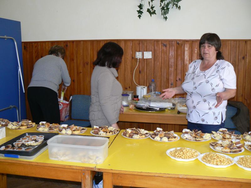 Členky OZ Lutilienka pripravujú na tácky prinesené koláčiky na pohostenie v príležitostnej kaviarničky
