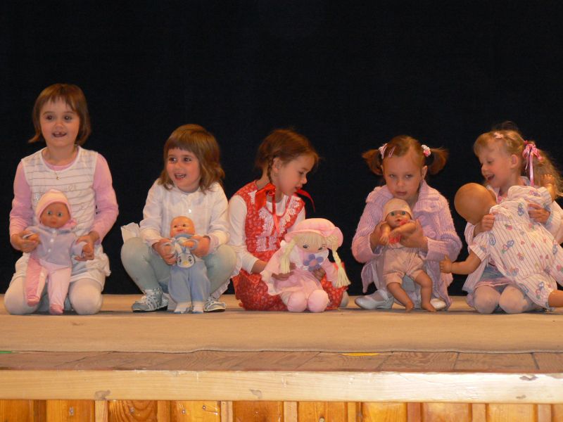 Dievčatá materskej školy pri vystúpení s bábikami (Anička Grzinčič, Nelka Hromádková, Eliška Pružinová, Miška Urgelová, Paťka Ambróziová)