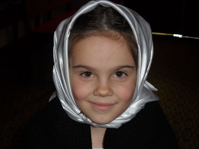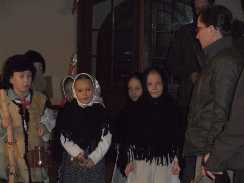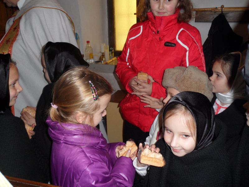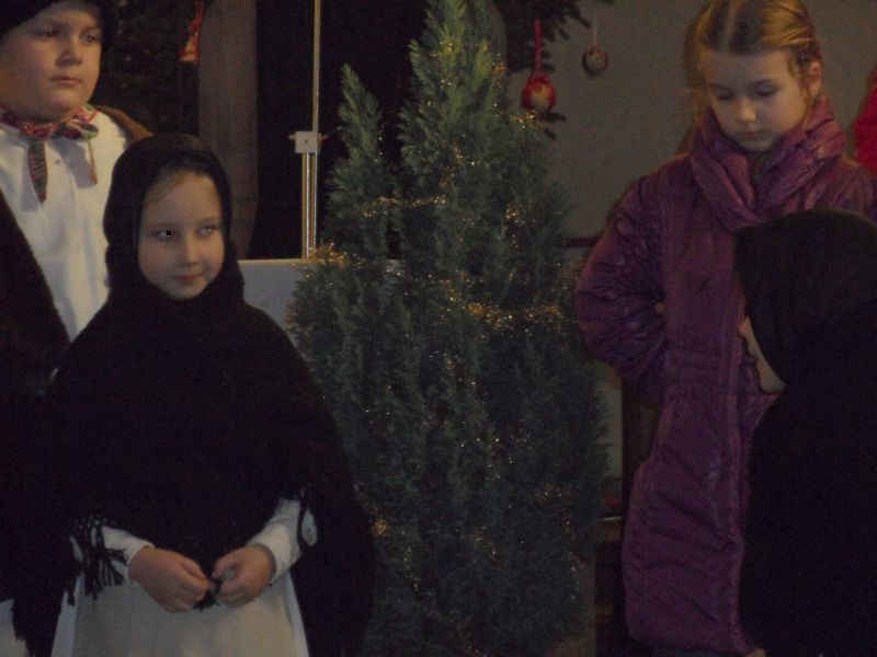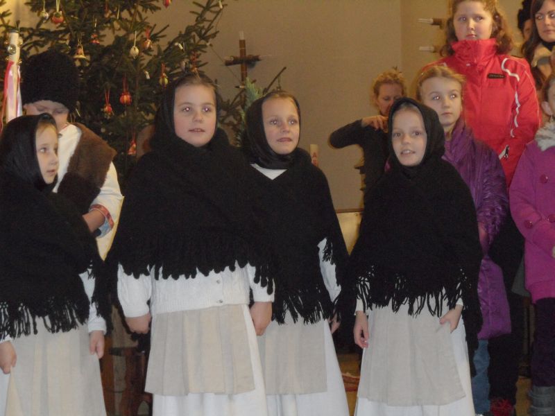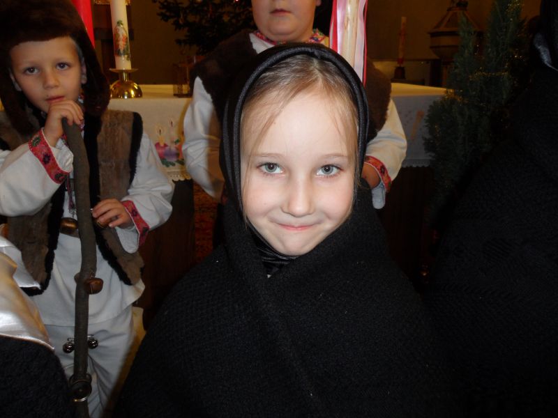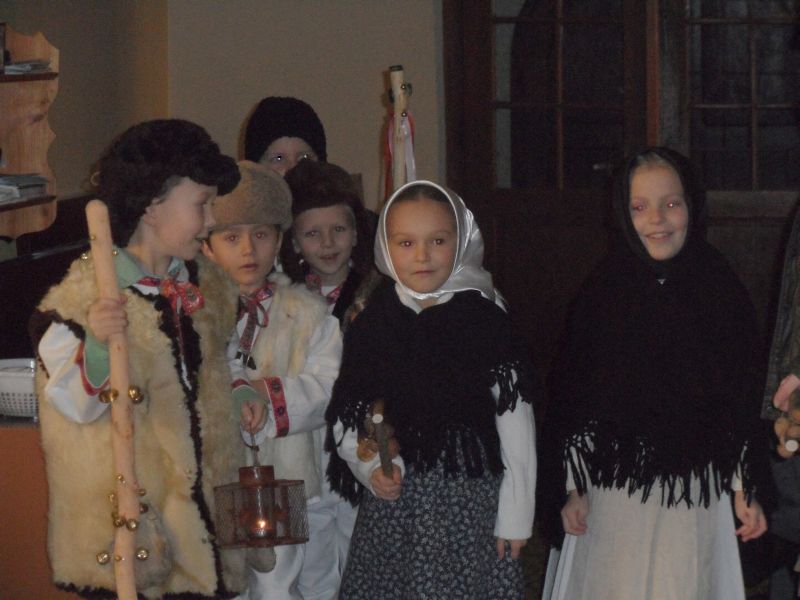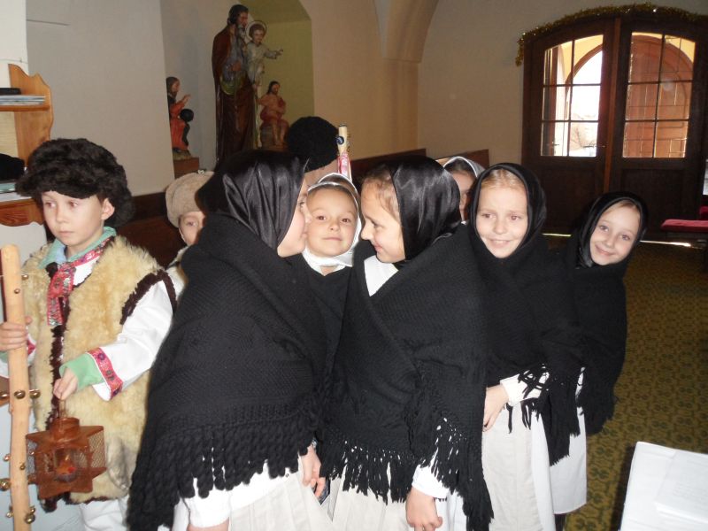 Deti sa pripravujú na jasličkovú slávnosť. V popredí Miška Gregušová